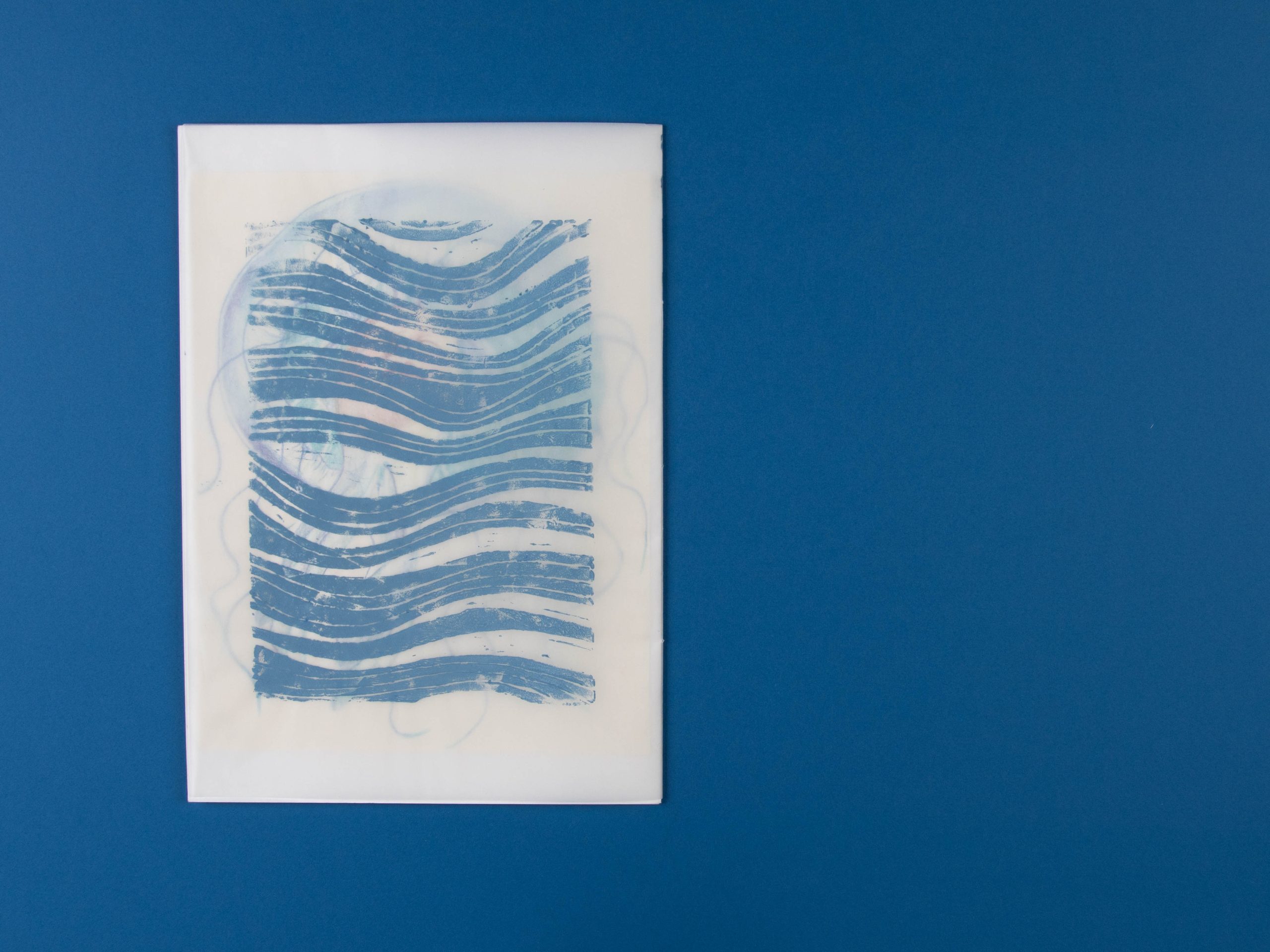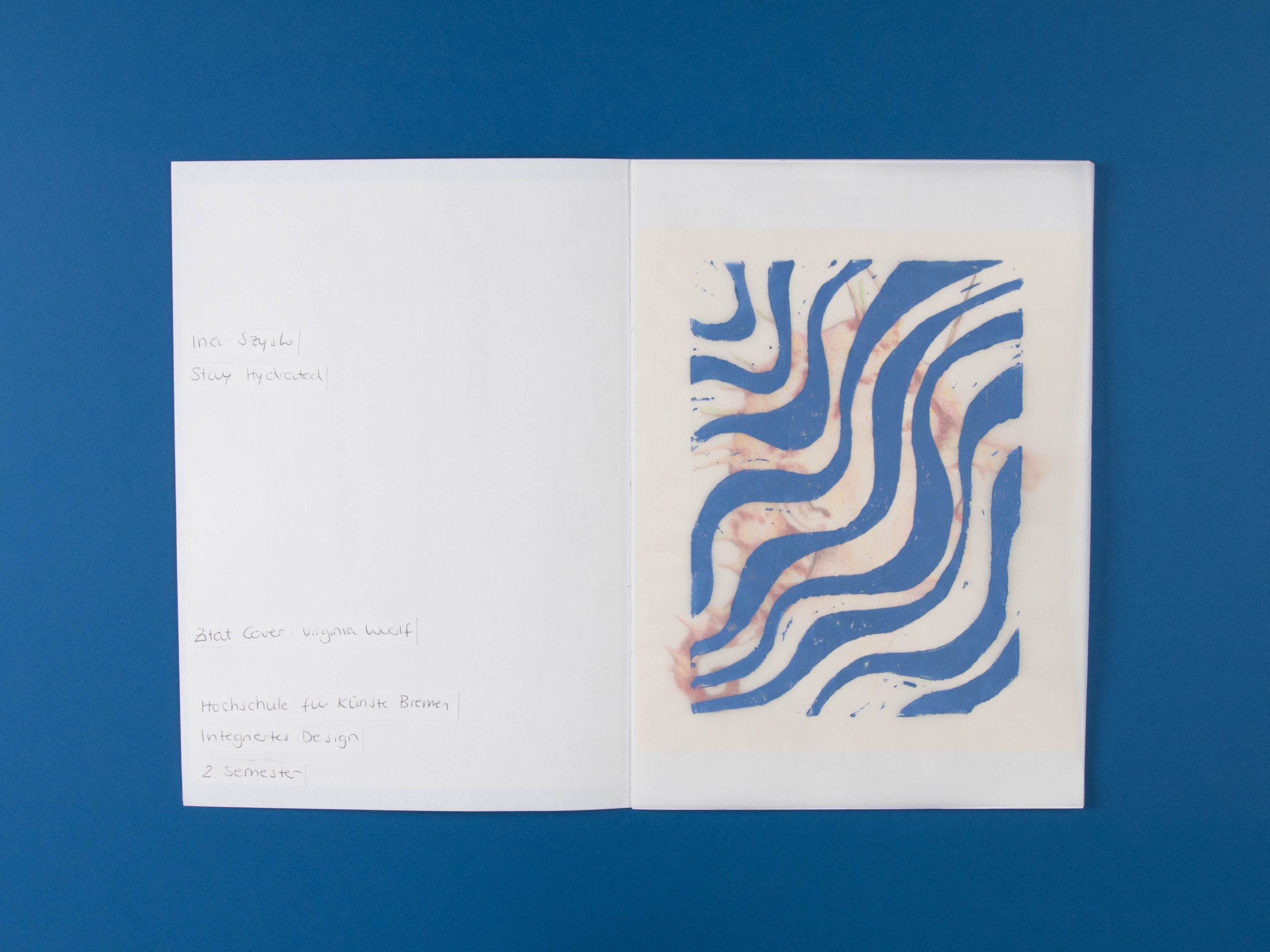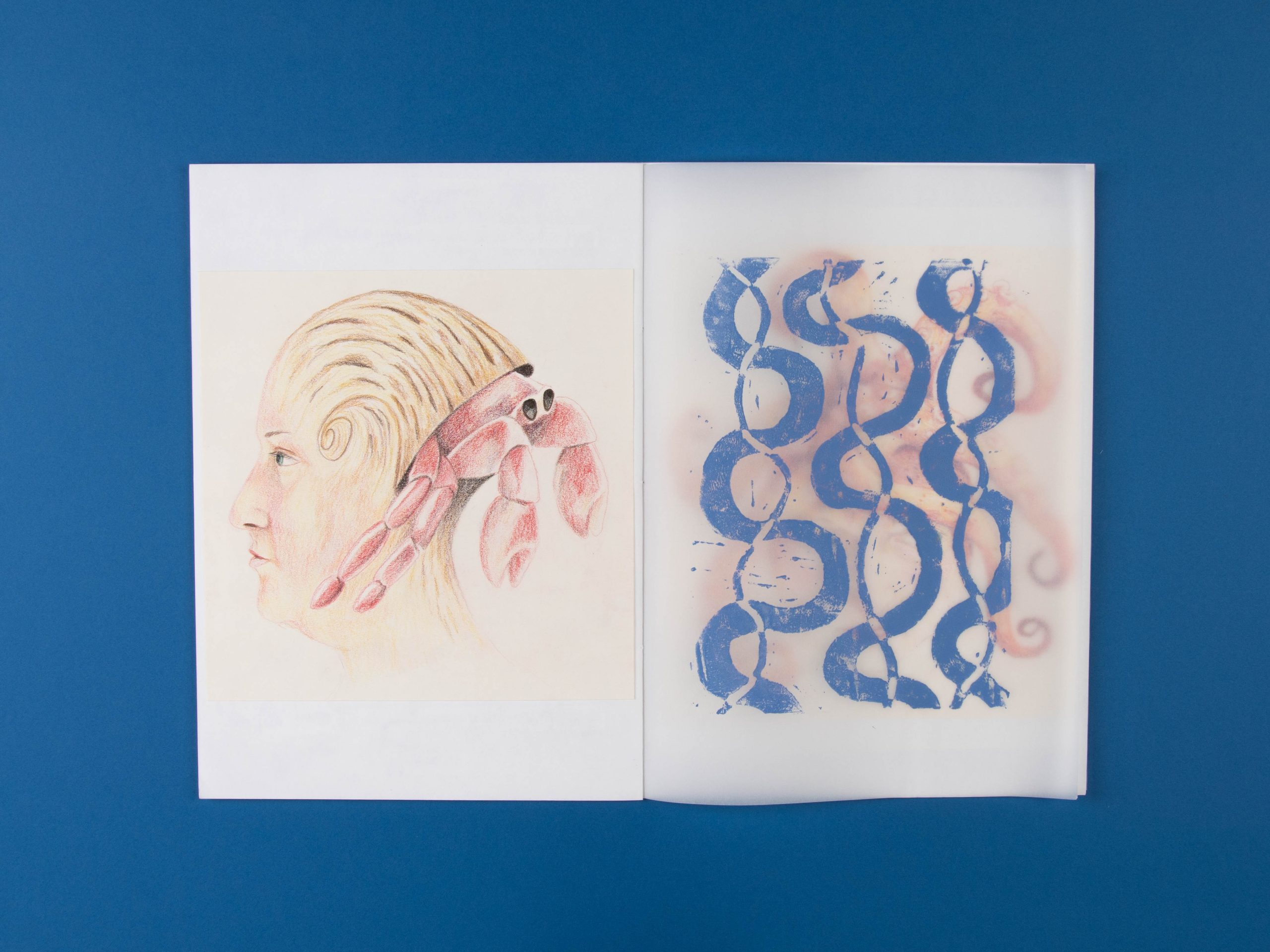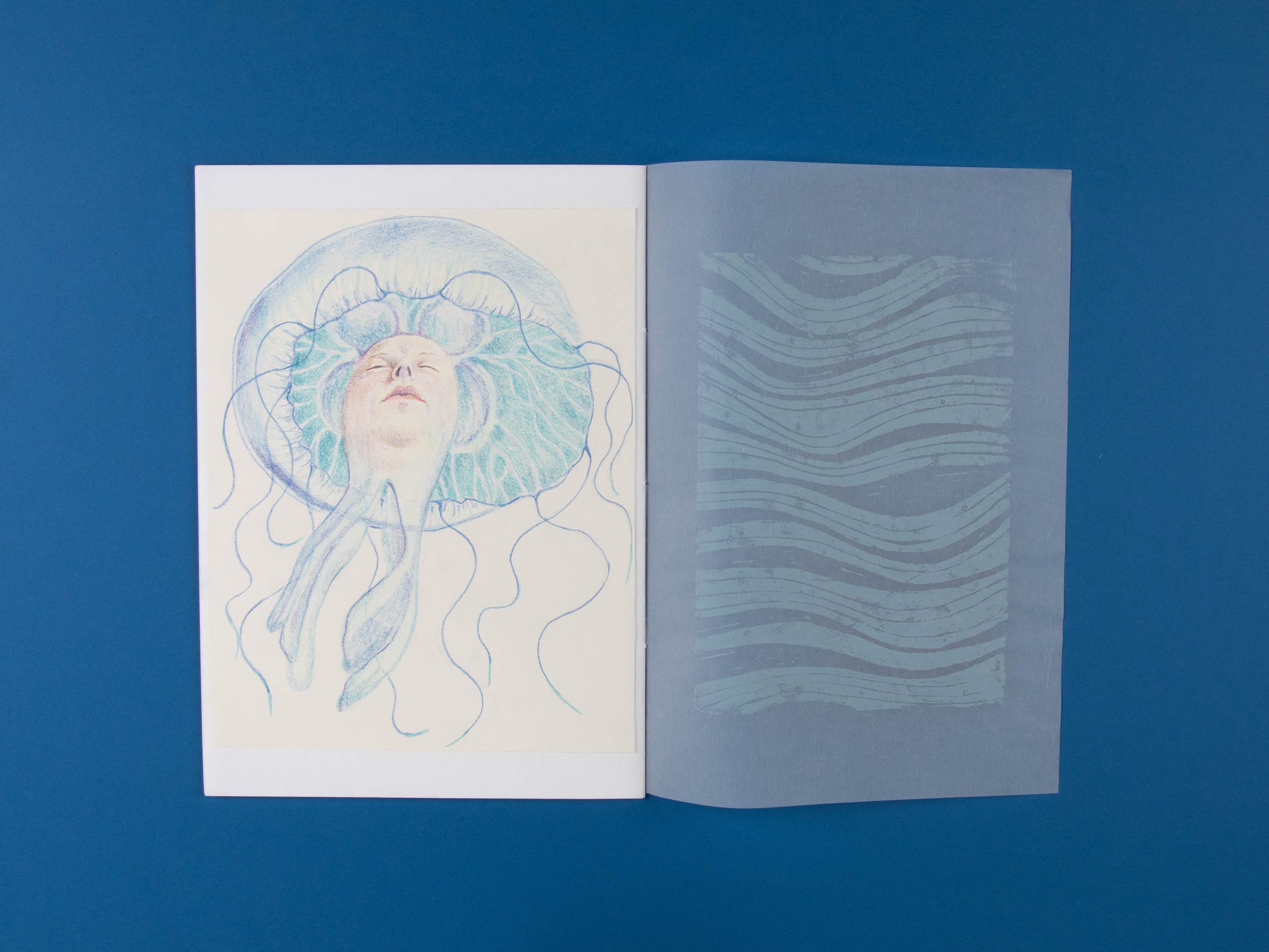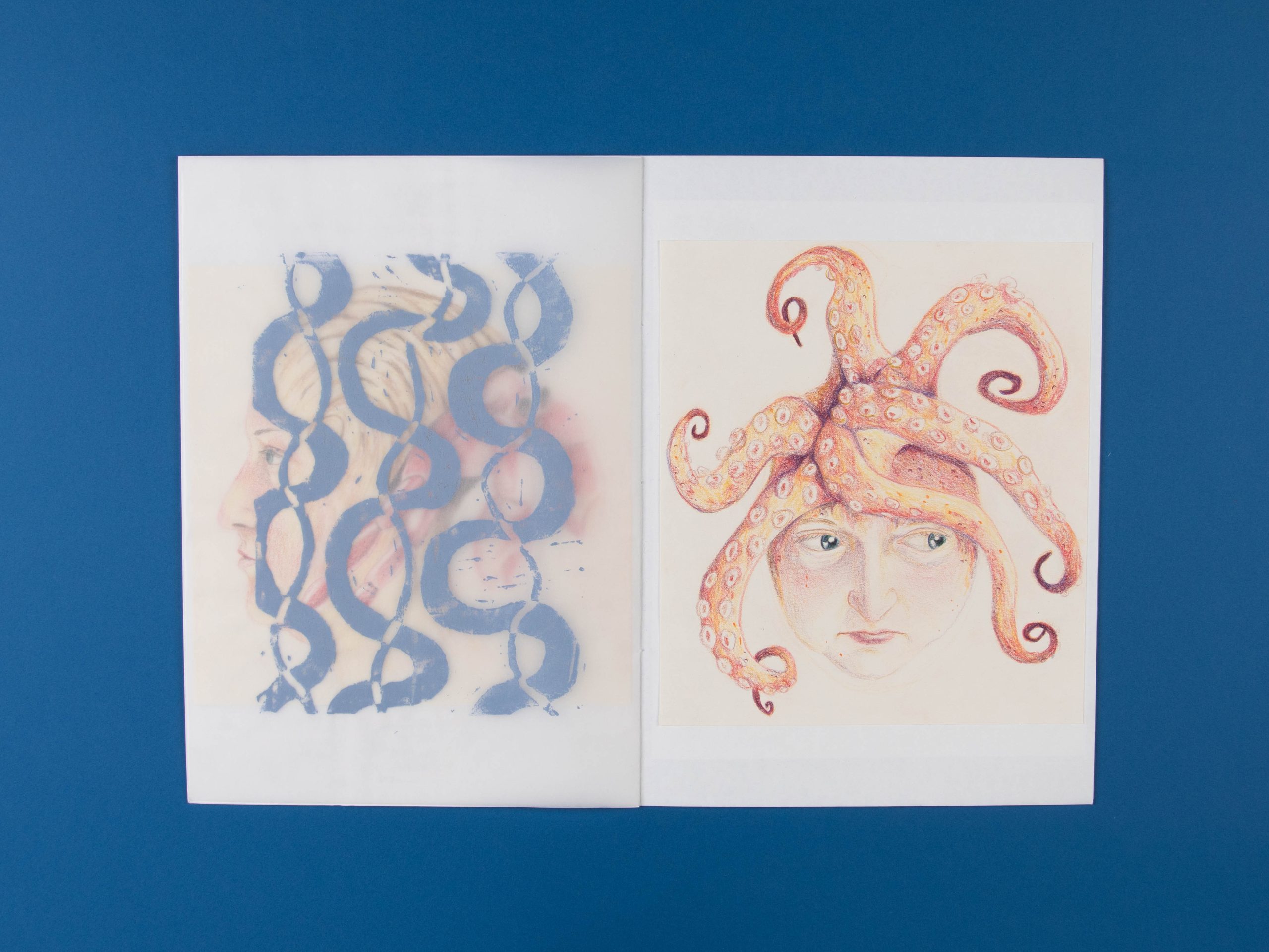 Ich habe in dem Zuge einige Selbstporträts aus unterschiedlichen Perspektiven gezeichnet, die ich mit verschiedenen Meereslebewesen verbunden habe. Ergänzt werden die Zeichnungen mit Linoldrucken, die alle fließende Muster zeigen. Dadurch, dass sie auf Transparentpapier gedruckt wurden, erzeugt es im Heft einen interssanten Effekt.