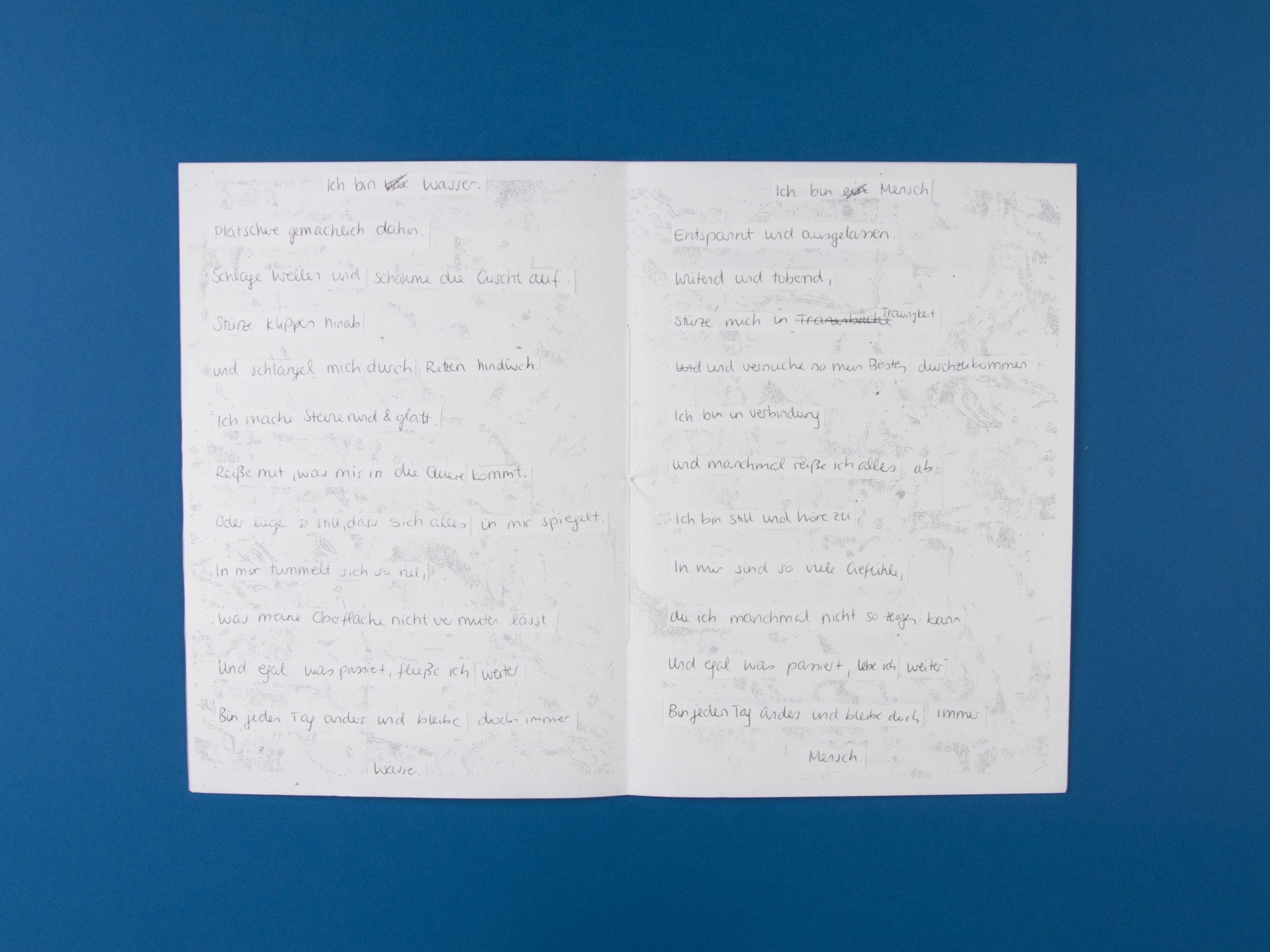 Dazu habe ich einen Text geschrieben, in dem es darum geht, dass ich wie Wasser jeden Tag anders und doch immer gleich bin. Mal bin ich ruhig, mal bin ich aufbrausend. Trotzdem bleibe ich immer ich.