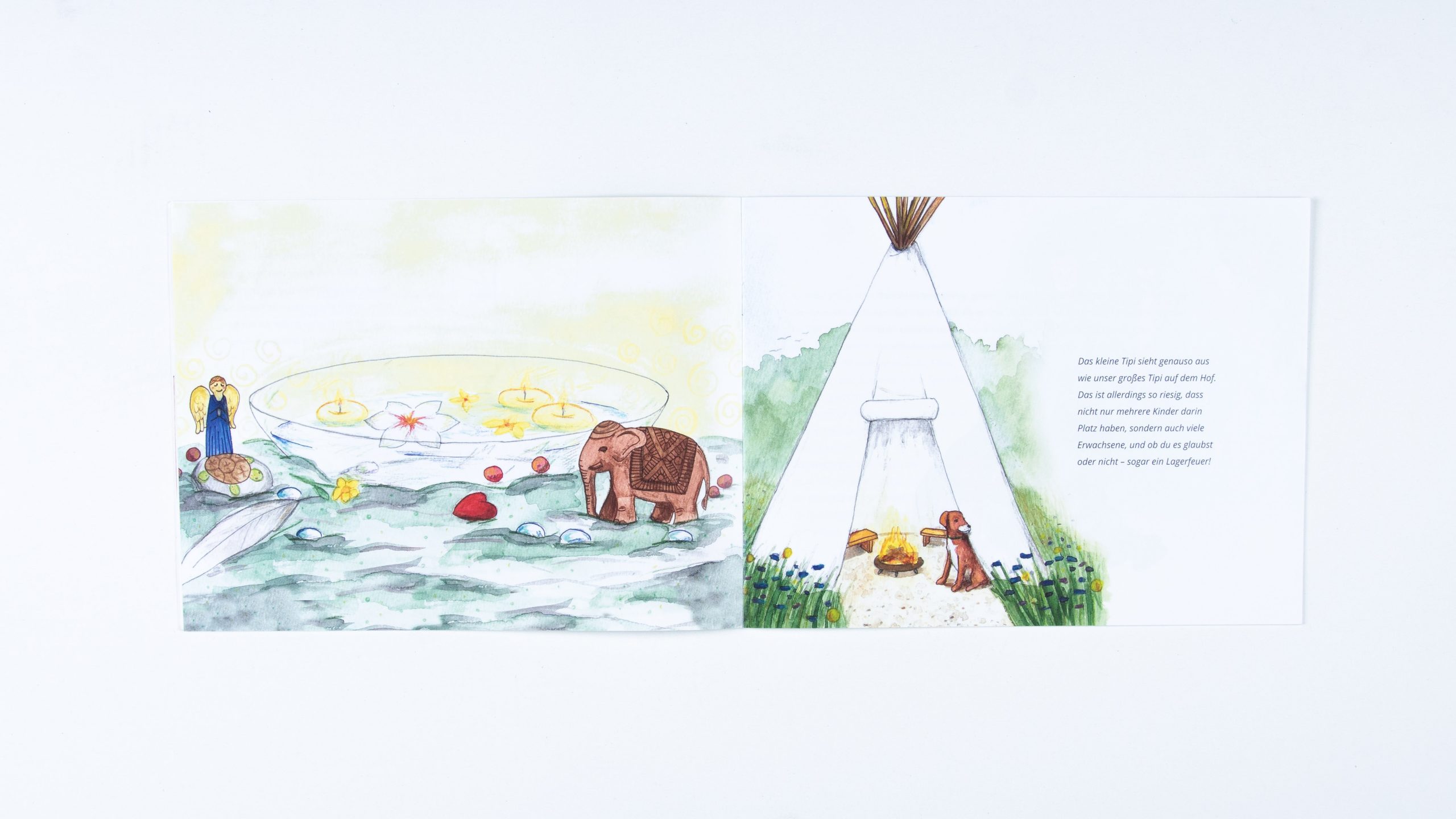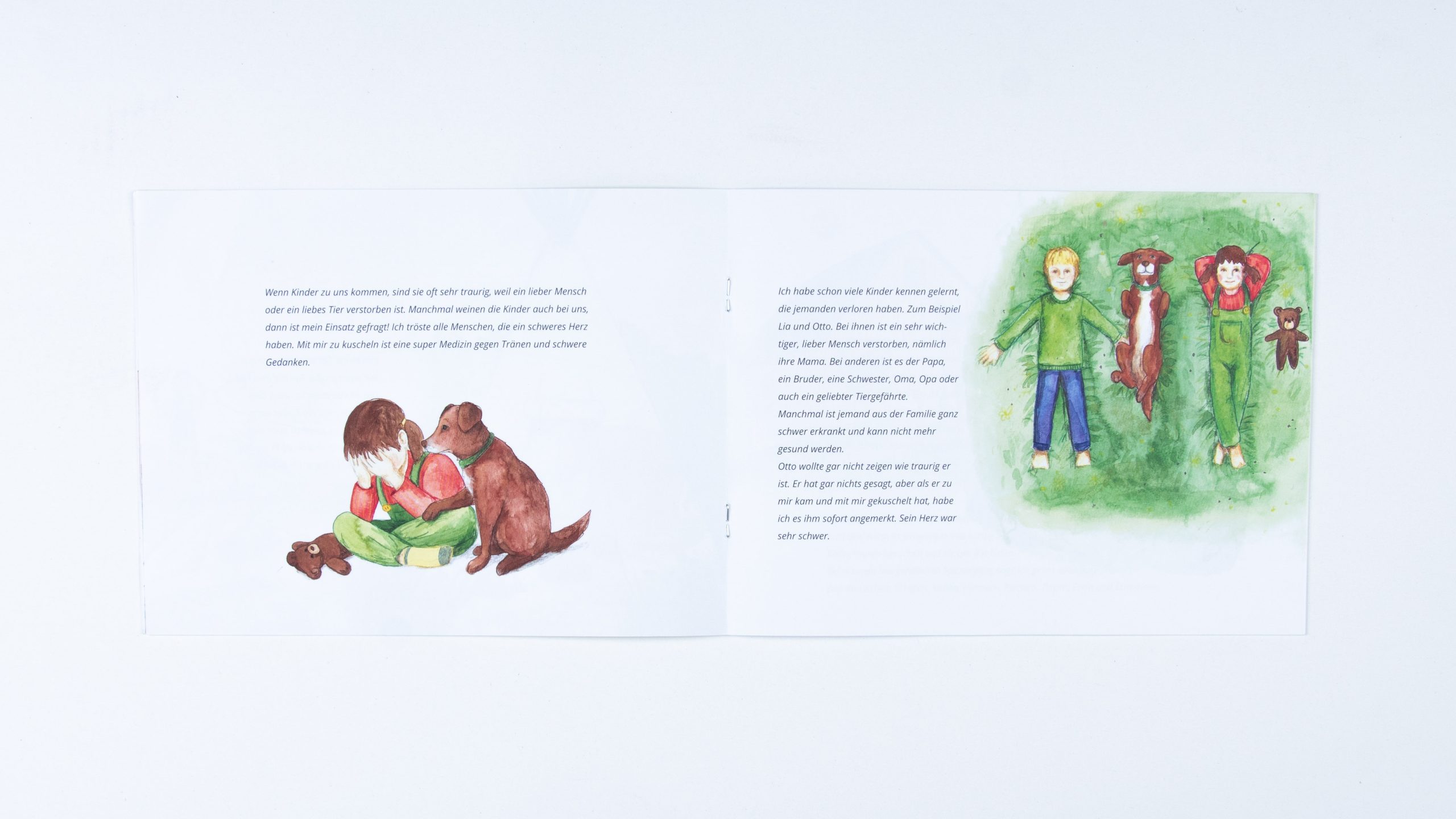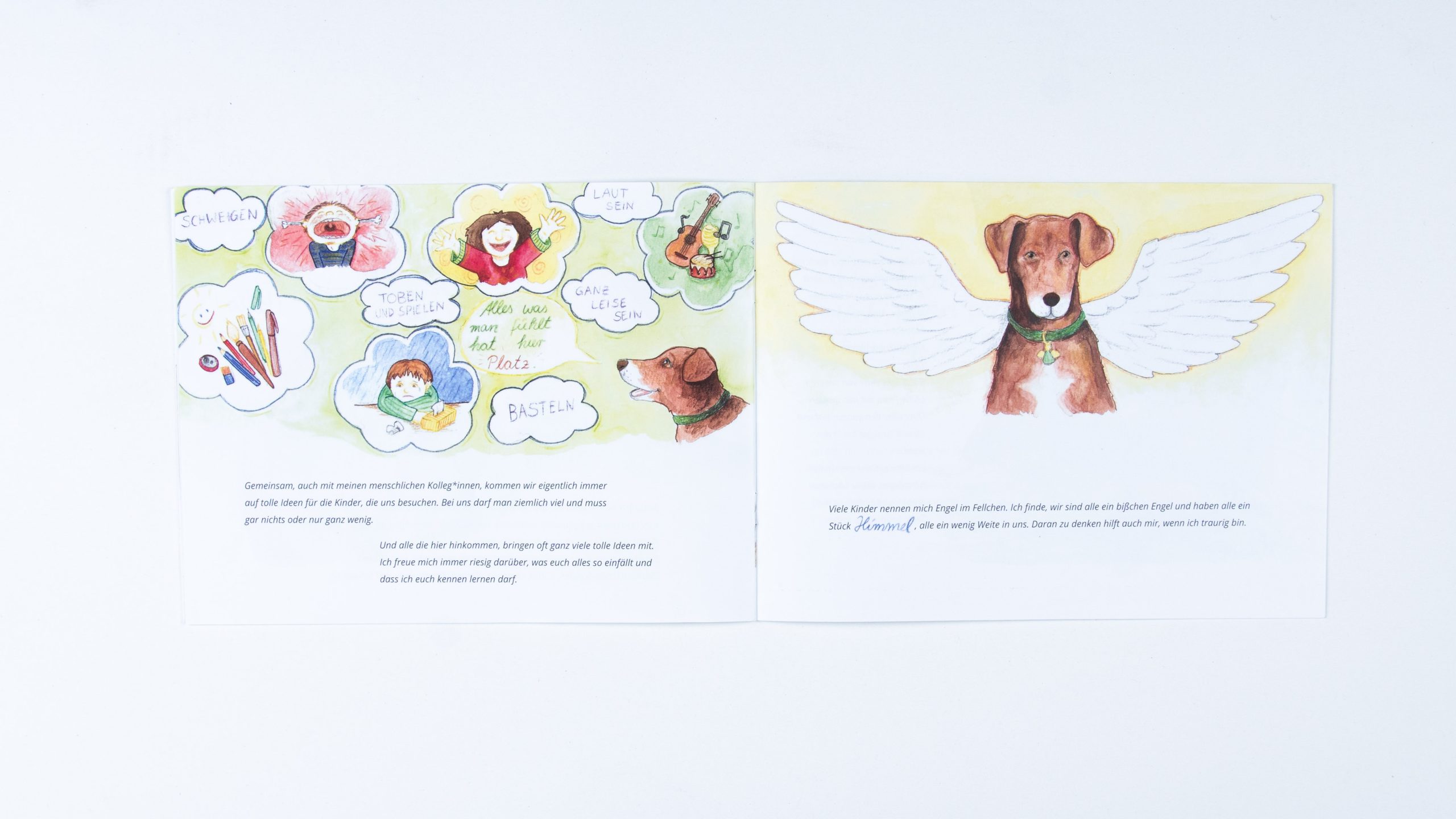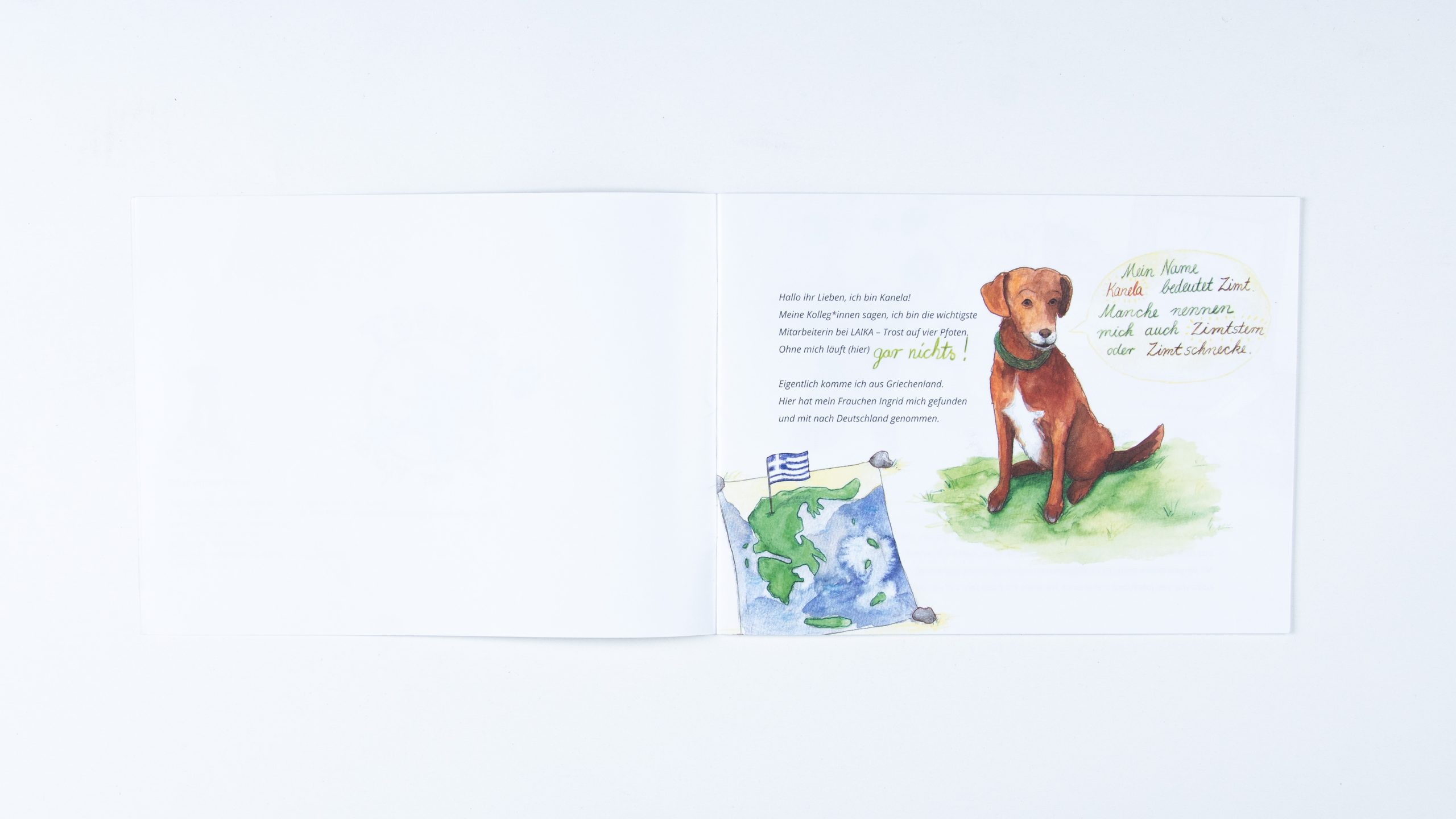 Im Jahr 2021 kam die Idee auf, dass es ein Infoheft geben soll, welches von der Aufmachung an ein Kinderbuch erinnern soll und Kindern und Eltern Einblick in die Arbeit des Vereins geben soll. Geführt wird man durch das Buch von der Hündin der Vereinsleitung – Kanela. Der Text wurde von Monique Kluß und Inken Horn geschrieben, das Layout stammt von Linda Mieleck und mit den Illustrationen wurde ich beauftragt. Die Bilder sind aus einer Mischtechnik aus Aquarell und Buntstiften entstanden.